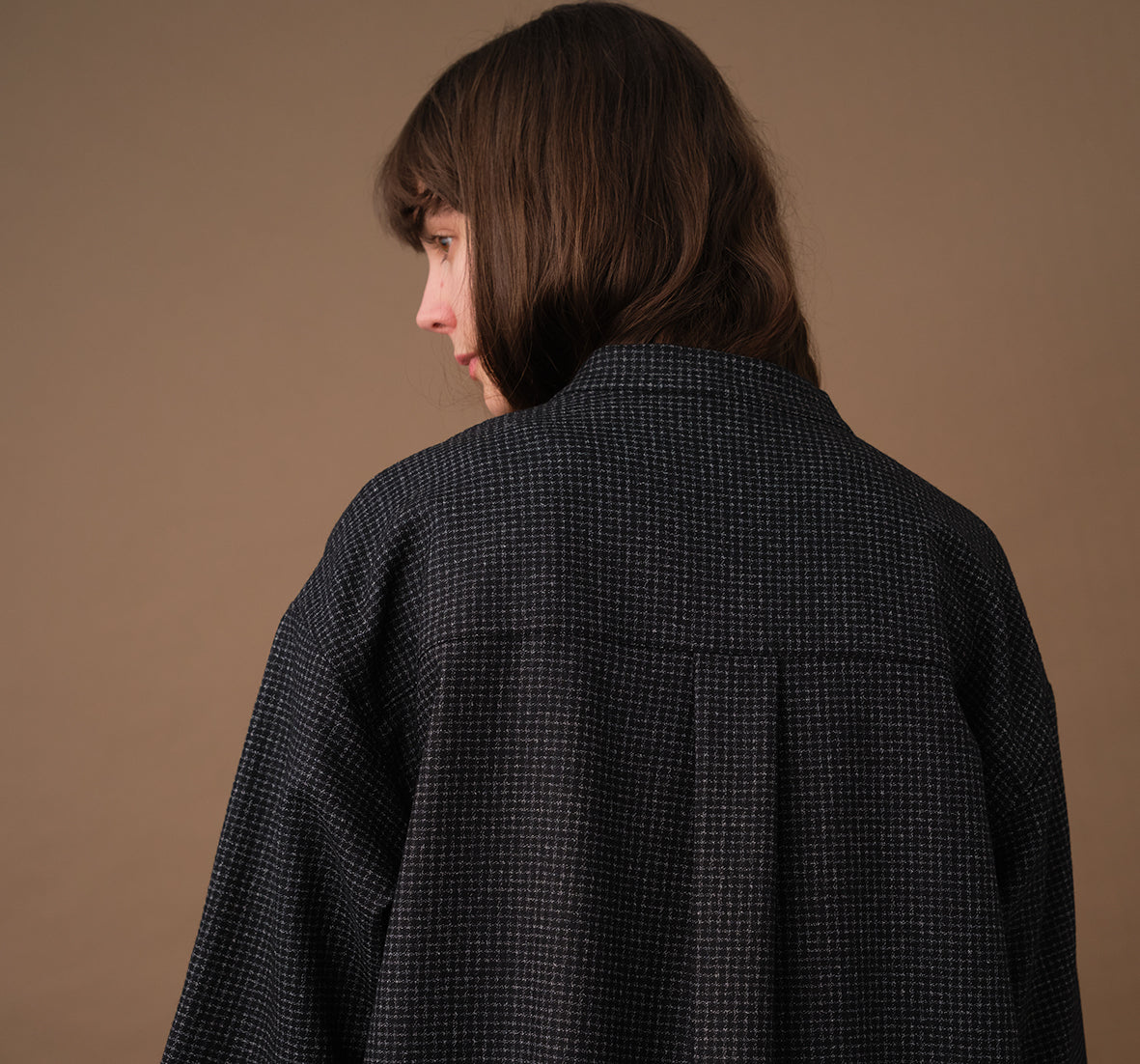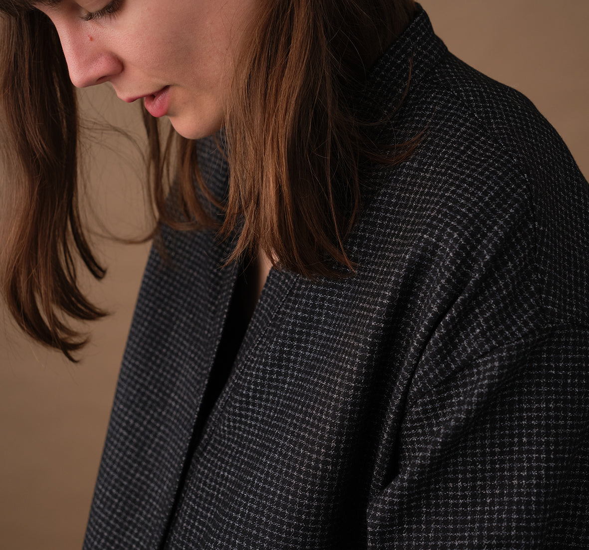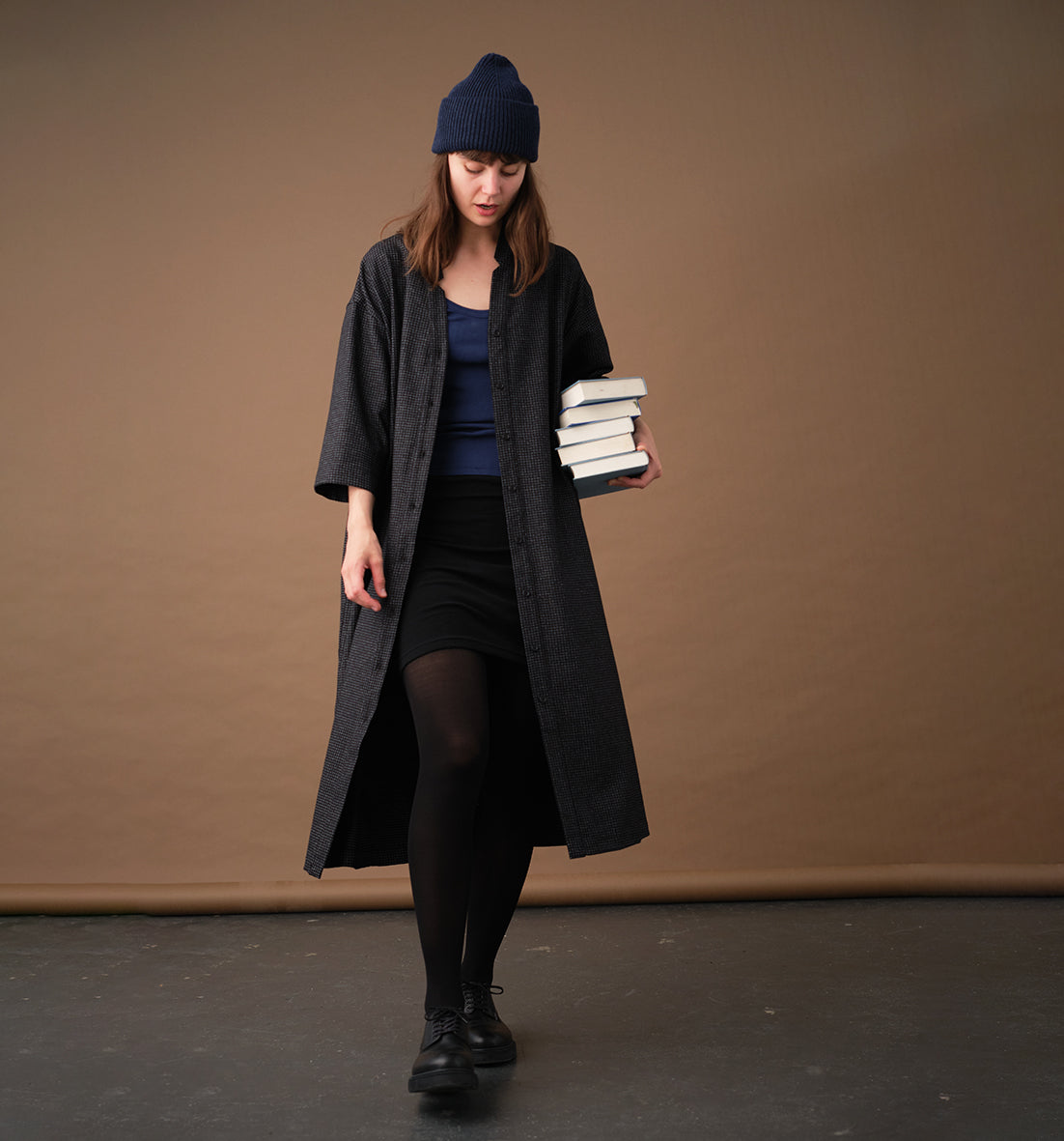 Unser Kleid Naja Stenhimlar. Ein knöchellanges Kleid mit schönen Kragen-Details. Mit Falten am Rücken und Taschen an den Seiten. Naja sieht sowohl offen als auch geschlossen gut aus. Kleine schwarze Knöpfe vorne in der Mitte. Aus einem Reststoff genäht.