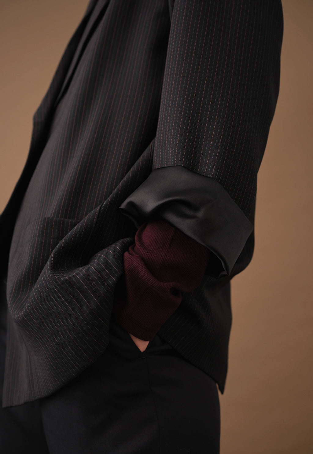 Unsere Jacke Sonia Kritstreck. Eine lässige Jacke mit langen Ärmeln und zweireihiger Knopfleiste. Vollständig gefüttert, Schlitz hinten und zwei Taschen vorne. Aus Deadstock-Stoff genäht.
